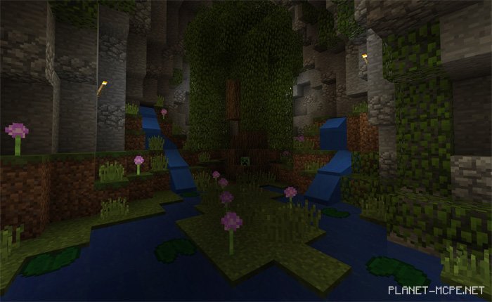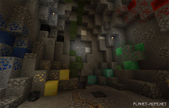 The world showcased on the mapxBlue’s Review World (Demo World)” will be beneficial for you if you’re interested in discovering the changes brought to the realm of Minecraft Pocket Edition by any texture pack, particularly a texture pack designed for PvP. All weapons and tools are clearly displayed in a collection of elements presented on the walls. Additionally, there is a section dedicated solely to ores and other textures typically included in such texture packs for Minecraft PE.