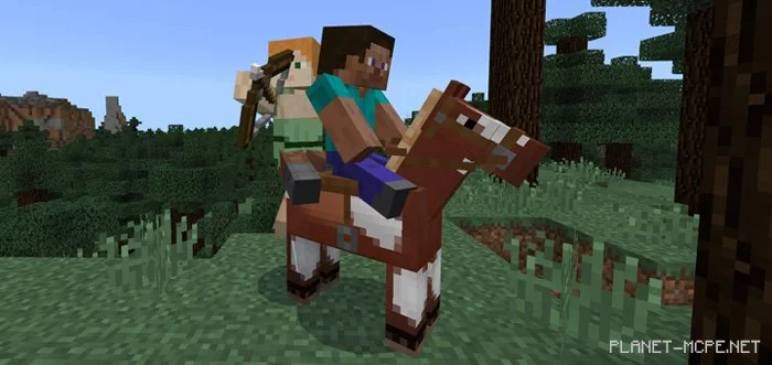 The mod «2 Player Horse Riding» enables two players to ride a horse together in Minecraft Pocket Edition. Finding horses, especially saddles, can be quite challenging in the early stages of MCPE, making this mod a great way to enhance horse riding accessibility. It also looks fantastic when two players are galloping on the same horse simultaneously.