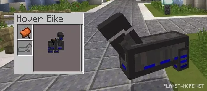 The flying bike, introduced by the mod“Alex’s Hover Bikes (Flying Bike)”, is the fastest mode of transportation in Minecraft Pocket Edition. Its mechanics allow for rapid movement over long distances, both on land and in the air. This bike is completely immune to damage from falls, making it perfect for use in almost any situation. Not only is it the quickest way to travel, but it also provides a fantastic source of fun in MCPE.