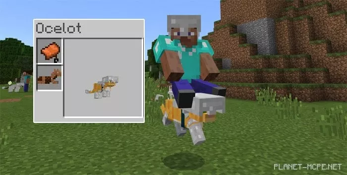 The ocelot will now spawn in the MCPE world with a complete set of iron armor by default. You can tame it just like before by feeding it raw fish. After taming, it will transform into a cat wearing full armor, essentially becoming a stronger version of the regular ocelot.