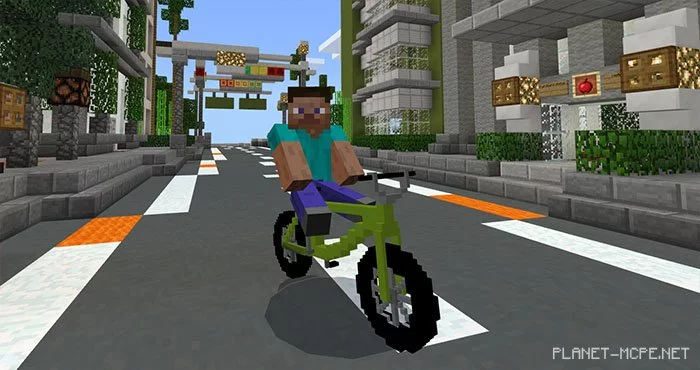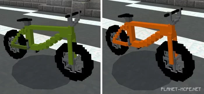 The mod “Bike (Bicycle)” introduces a fully functional stunt BMX bike to Minecraft PE, specifically for Minecraft: Bedrock Edition. This bicycle can jump and easily maneuver in various directions, making it quite flexible and reminiscent of real-life BMX bikes. There is a wide array of colors available, but changing the color will require downloading an additional resource pack.