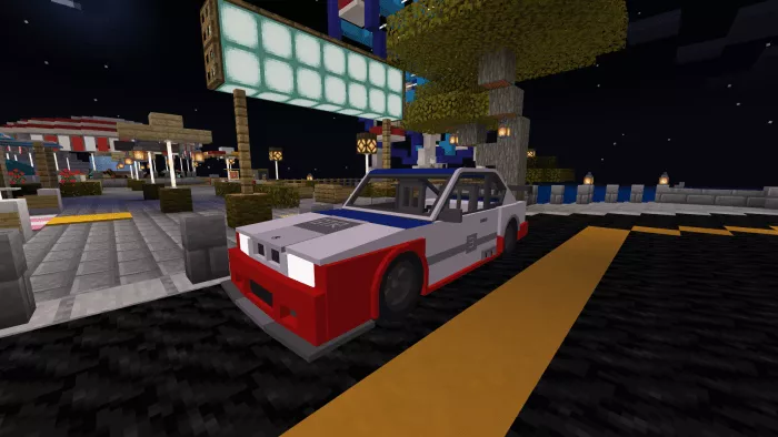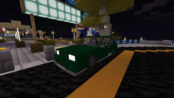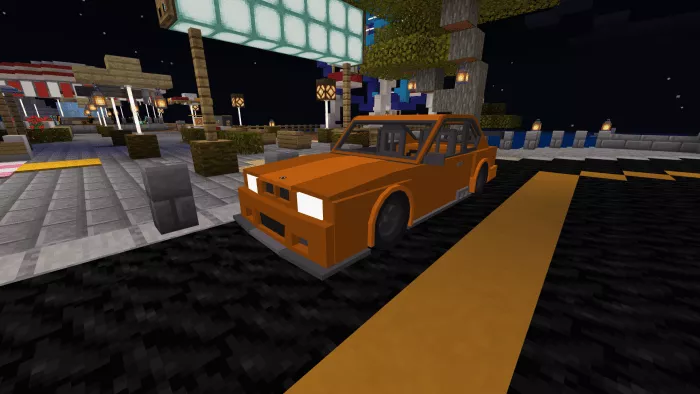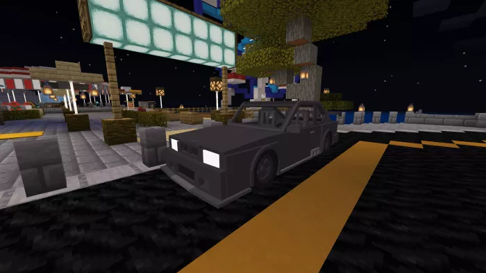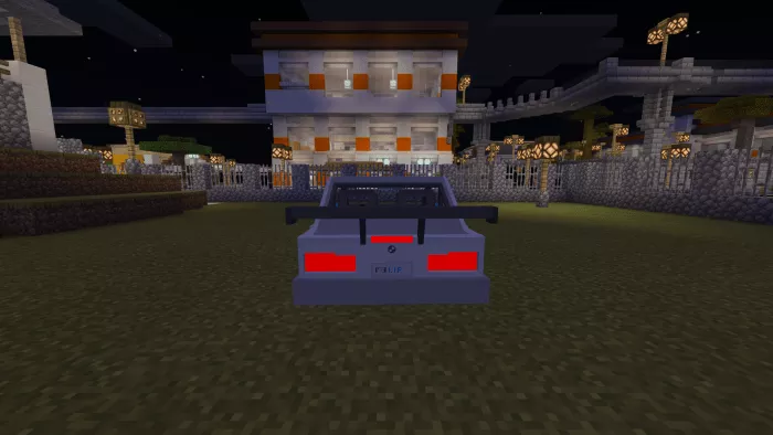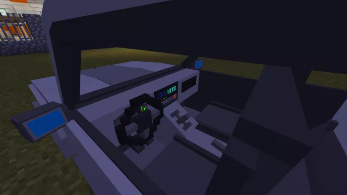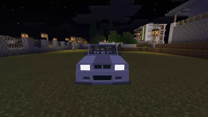 The Minecraft vehicle version features 4 seats: 2 in the front and 2 in the back, with the ability to reach high speeds in a short time, an inventory, wheel animations, and custom sounds.