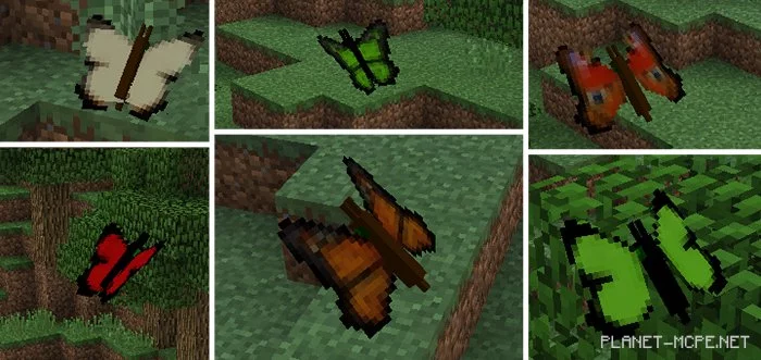 The mod «Butterfly» introduces 9 unique butterfly species into Minecraft Bedrock, which can be discovered across various biomes like forests, jungles, and more. These butterflies are completely harmless and add a delightful, realistic touch to the game. They also feature their own animations, making them appear very lifelike in the world of Minecraft.