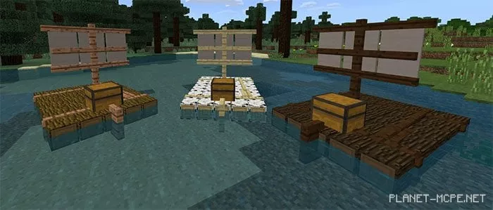 Mod “Chested Sail Raft (Raft with Chest)” replaces all the different types of boats in Minecraft PE with rafts in various styles and colors. Each raft comes equipped with a chest, allowing you to store your items during your aquatic adventures in MCPE. The chest features 27 slots, so you won’t have to worry about running out of space while exploring. The model is intricately detailed, incorporating sails, oars, and other elements to enhance realism.