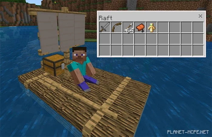 The raft operates similarly to a standard boat in Vanilla. The main difference is the presence of a chest for storing your belongings during your journey in Minecraft Pocket Edition. You can access the chest’s storage by either opening your inventory while seated on the raft or by sneaking up to it.