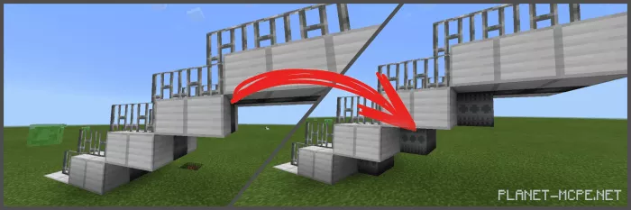 The applications of conveyor blocks are quite varied. For instance, you can create an amusement feature. When constructing escalators that move upwards, it is advisable not to build the entire staircase from conveyor blocks. Start by creating a framework using any other type of block, and then add the new blocks. Additionally, there should be no other blocks positioned beneath them (as shown in the image). Otherwise, the entire structure will collapse. For creating escalators that descend, you will need to use blocks oriented in the appropriate direction. The same rules apply as with the ascending escalator.