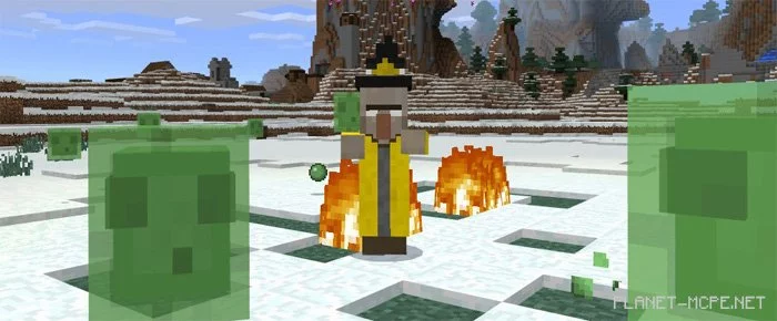 The mod «Elemental Witches» introduces four new witches into Minecraft Pocket Edition, each possessing a distinct set of abilities. They are considered mini-bosses due to their formidable strength compared to existing mini-boss mobs. The only advantage is that each witch is accompanied by minions in MCPE that will defend them.