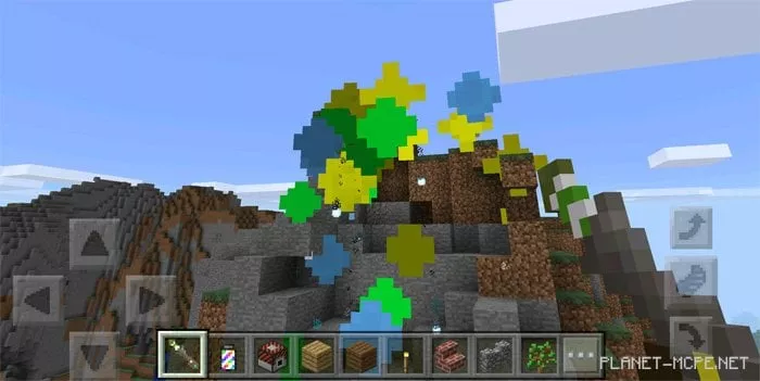 Let’s take a look at some of these items. Here we have the wavy firework launcher (bow and arrows). It’s best not to use it at full power, as the arrow will fly too far. It needs to hit an obstacle in MCPE, like the ground or a mountain wall, to explode.