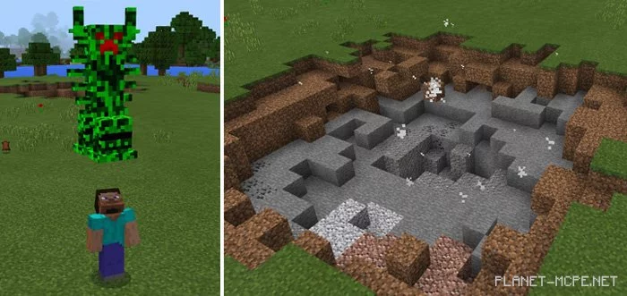 A quirky creeper, which is what it will become after installing the mod “Freaky Creepers“, is far more unpredictable in the world of Minecraft Pocket Edition than a regular creeper. It will chase you and attempt to climb onto your head. Then, it will start flashing as if it’s about to explode. But no, it won’t detonate just yet. This will only lead you to believe that you’re safe in MCPE. However, once you’ve convinced yourself of your safety, it will blow up. Poof – everything goes up in smoke!