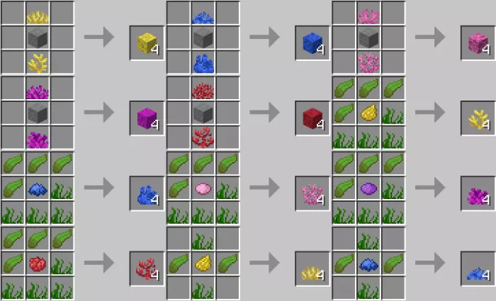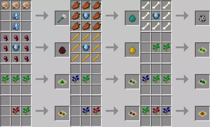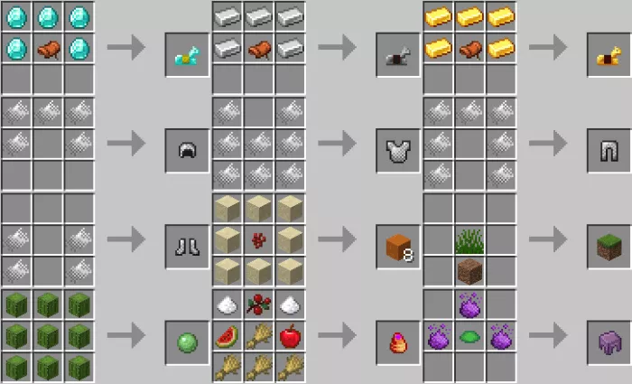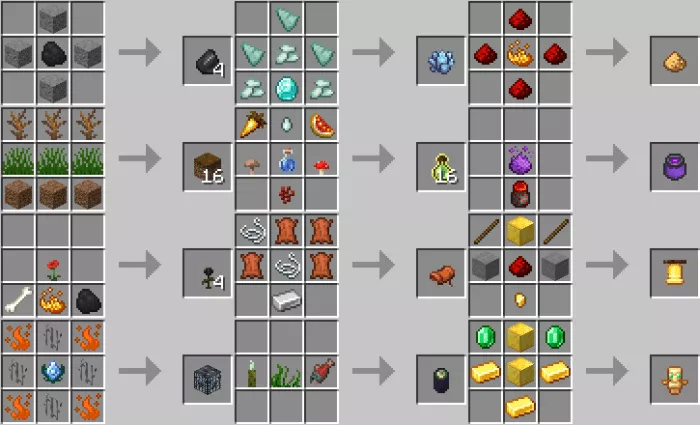 This mod makes some adjustments to the villagers. Now, farmers, stonemasons, clerics, and fishermen will offer different items and trade goods. By the way, if you find yourself in the swamps, be sure to visit the Minecraft PE witch. She is now a neutral mob that provides unique items. Here are a few recipes: