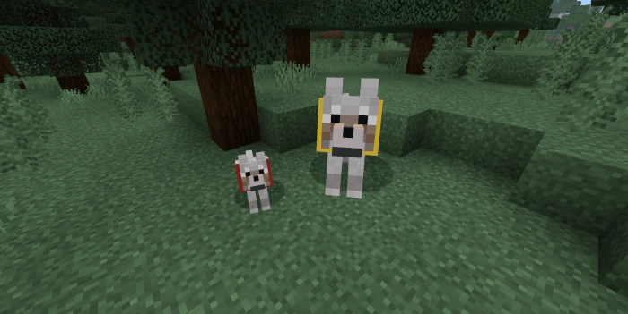 You can breed wolves from the mod using golden apples. Don’t be surprised if the pups grow at a very slow pace – this is due to their large size. You can also dye their collars. Remember to feed them more often in Minecraft on Android to heal them, as the tail mechanics do not function properly because of game limitations. Enjoy your gameplay!