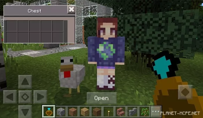 Besides being a lovely and affectionate partner, she can also be quite useful. For instance, you can make her carry some items in Minecraft PE for you (27 slots). Sit on your companion and use the Open button to access her inventory.