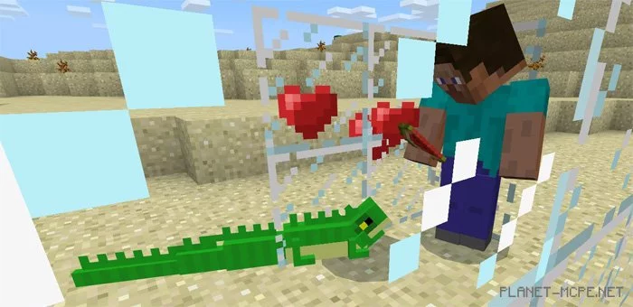 A tamed iguana will follow you throughout the world of Minecraft Pocket Edition. To heal it, feed it watermelon, potatoes, carrots, or apples. If a hostile mob attacks you, the iguana will defend you at all costs.