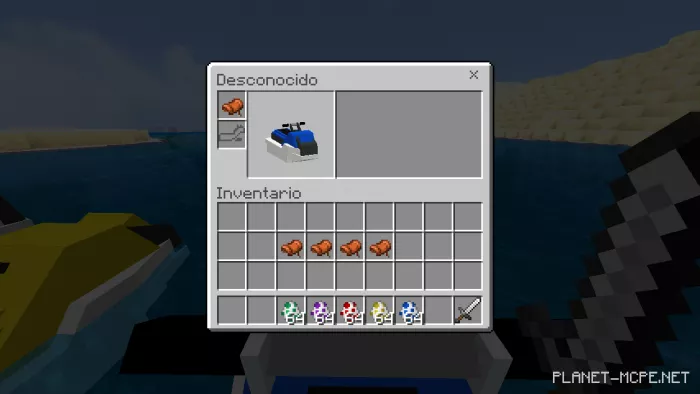 To use this mod, you can only do it in creative mode in Minecraft Bedrock. To start, go to your inventory and find the slot with the hydro scooter. Then click on your favorite color, and the jet ski will appear on the water. The capacity is limited: maximum two people. Also, when moving forward, the jet ski makes a sound. When you start moving – remember that any obstacle is dangerous for you, carefully choose your route and beware of collisions.