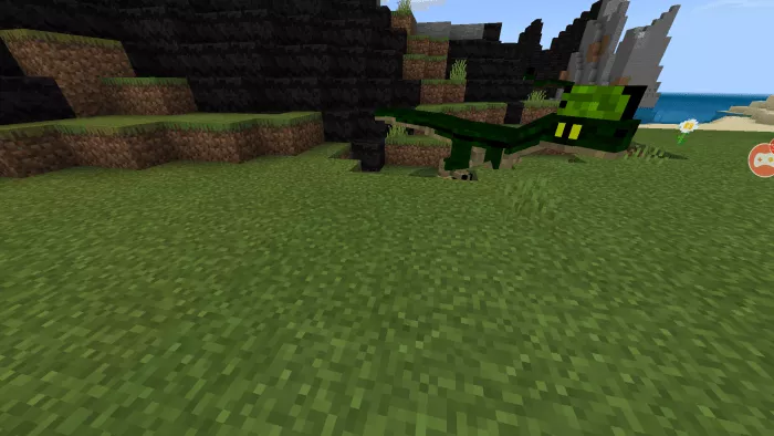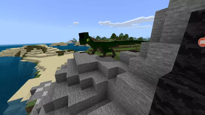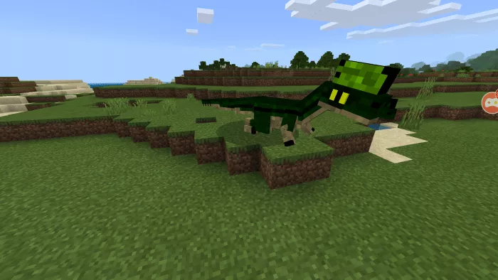 This carnivorous animal has 9 attack points, delivered at wolf-like speed. Its dimensions are approximately 2 blocks in height and 6 blocks in length. To breed dilophosaurs, you need cooked meat (any except fish), and for taming – a bone.