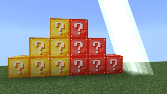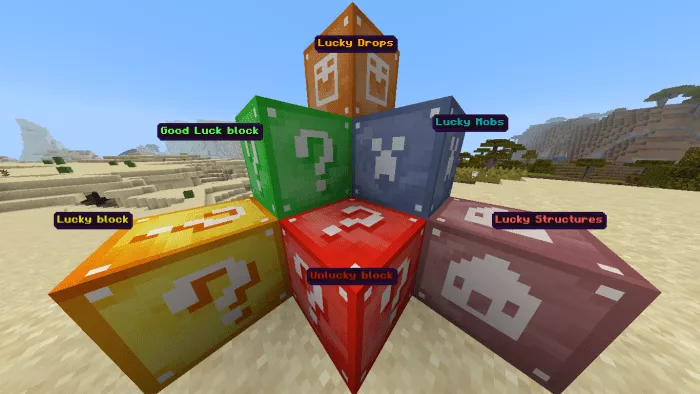 In the Lucky Blocks mod featuring 5 types, as you might have guessed, there are five varieties of random blocks awaiting you. You can find them almost everywhere in Minecraft Bedrock Edition. Therefore, if you’re looking to turn your gameplay into true chaos, this creation is definitely for you.
