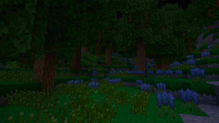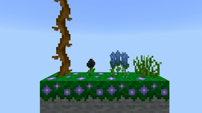 Black lotus flowers will emerge in a new biome. They can be used to create black dye. Blue lavender is also exclusive to this area, and from its blossoms, you can craft blue dye. Withered vines can be broken down to yield sticks. Glowing grass will enhance the beauty of this biome even further.