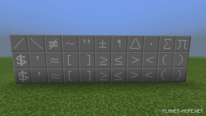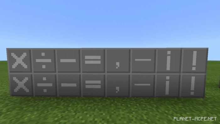 The mod «Mathematic (Mathematics)» will introduce various mathematical symbols, allowing you to conduct a much more enjoyable lesson in Minecraft Bedrock, rather than the usual dull class. The textures of the mod are compatible with versions 1.8, 1.9, 1.10, 1.11 and above. Stay tuned for the next update.