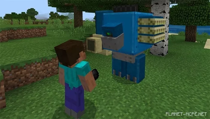 Mod “Mechanic (Механик)” transforms the hostile creeper into a helpful mechanic. The Mechanic is a neutral robot-buffer that does not attack players in Minecraft Pocket Edition unless it feels threatened. You can tame it by using some coal, allowing you to ride it for quick travel and easier navigation through challenging terrains like lava or steep mountains.