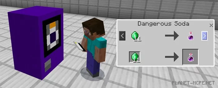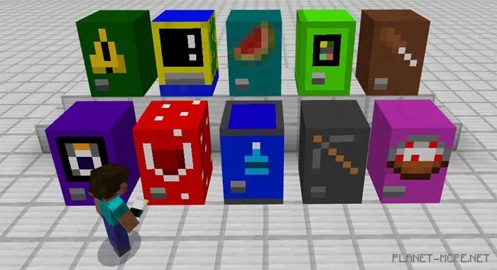 Do you feel that there are too few mechanisms and devices from real life in Minecraft PE? If so, we are excited to introduce the mod “Mine-Machine” for Minecraft Pocket Edition, which adds 14 different vending machines to your favorite game. You can utilize these devices to purchase food and drinks, but you’ll need to exchange a new in-game currency with the machine. Additionally, if you don’t intend to use the new mechanism as intended, you can also employ the new block in MCPE for decorative purposes!