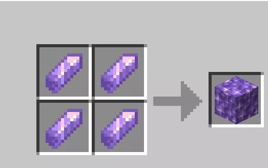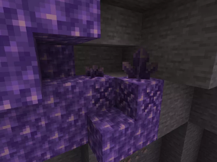 Amethyst. This gem will be generated underground quite infrequently. Currently, it can be found among various types of rocks, but the author plans to change this in a future update. If there is empty space above the amethyst, you will be able to discover crystals that it will grow. These crystals are essential for crafting an amethyst block and unique glass.