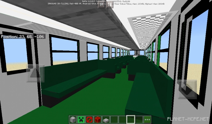 The rails shown in the screenshots are invisible, but don’t worry; this is just for aesthetic purposes. The mod includes a version where the rails are visible. Additionally, it features two behavior packs. One pack offers a standard mode while the other places you at the front during travel, as depicted in the screenshot.
