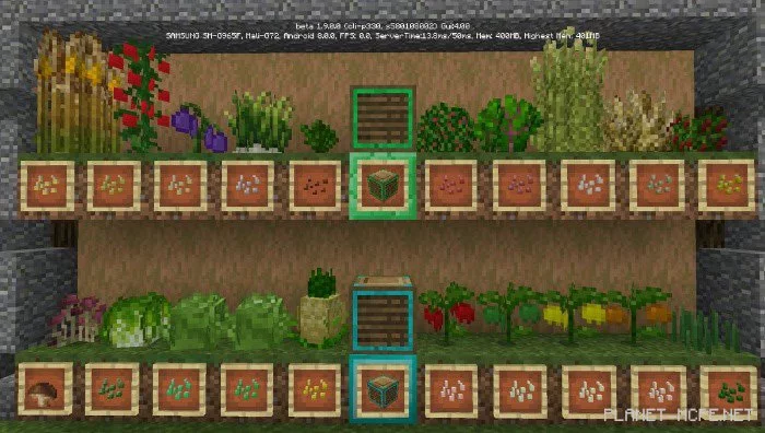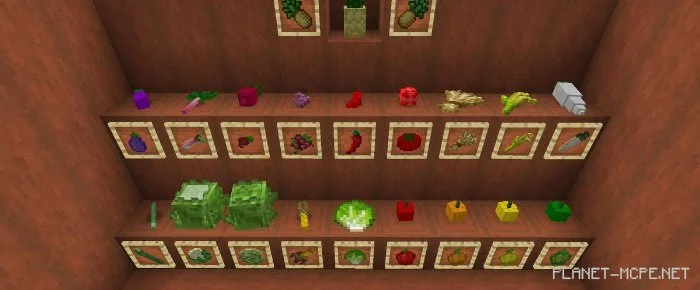 The mod «More Crops (Additional Crops)» introduces 20 new crops to the game. Plant seeds in Minecraft, and they will grow within a short period. Some crops can be harvested instantly, while others require cutting to produce more. Additionally, it adds items that can be placed on the ground to enhance the aesthetics of your world in Minecraft Bedrock.