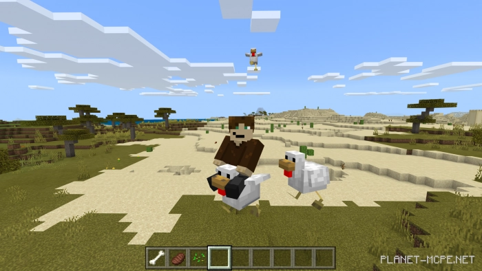 You can ride chickens, but they are not suitable as transportation due to their very slow speed. The author tried to change this, but unfortunately, he couldn’t. To make the chickens look more realistic when you ride them, their size has been slightly increased. Now because of this, chickens can attack sheep. Chickens will also follow commands if you name them after a specific item as a reference to YouTube.