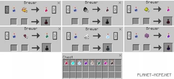 More Potions (Больше Зелий) is the first mod to introduce custom consumables into Minecraft PE! These potions function similarly to standard ones, providing players with various effects for a limited duration. Discover 8 unique and new potions available from a new type of villager: the Brewer!