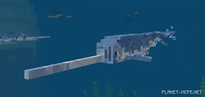 In Minecraft PE, the narwhal will take the place of the dolphin, a creature well-known to everyone. Due to the capabilities available for underwater mobs like dolphins, it is challenging to introduce many new abilities beyond those already present in the dolphin’s behavior. As a result, altering the narwhal’s behavior significantly in the mod titled Narwhal (Нарвал) for MCPE was not feasible.