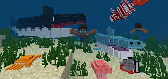 Mod “OceanCraft PE (Water Craft)” transforms certain mobs in Minecraft PE into aquatic creatures. Among the new entities are sharks, whales, crabs, and shrimp. Most of these new water mobs will not spawn naturally in the water, meaning you will need to spawn them manually using various spawn eggs or text commands in MCPE. Bring new life to the oceans with this mod!