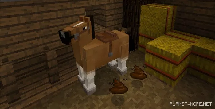 I doubt many have pondered this, but why don’t the animals in the MCPE world use the restroom? Today, we invite you to download a hilarious mod called Poop for Minecraft Pocket Edition, which will address this oversight and provide plenty of laughs for you and your friends. Now, all animals (most commonly horses) will “go to the bathroom” anywhere they please, often accompanied by distinctive sounds. You can pick up the droppings (poop) from the ground and throw them at enemies, who will experience the nausea effect upon impact.