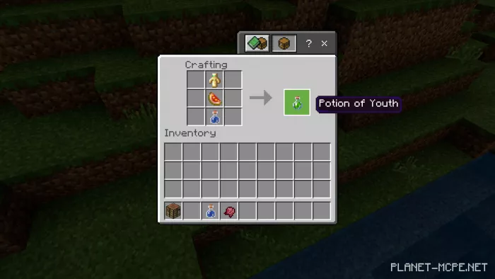 This potion transforms anyone who consumes it back into a child. Both health and hitbox are halved. Additionally, you gain speed and experience nausea simultaneously. Crafting ingredients include: a bottle of water, a sparkling slice of watermelon, and an Immortality Totem.