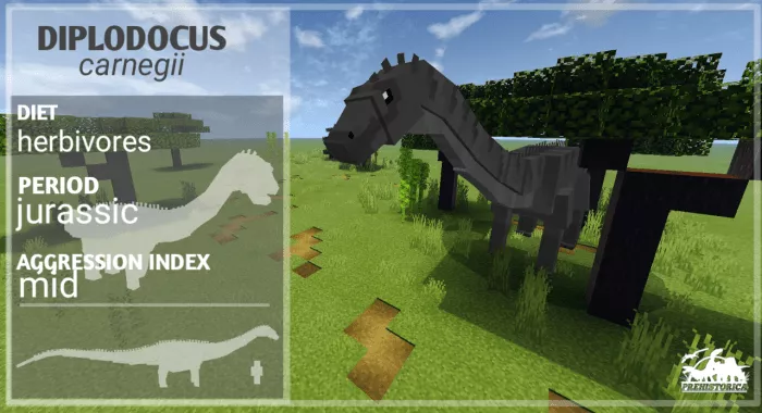 Diplodocus Carnegi. Its long neck and tail help it defend against predators. It is friendly towards players.