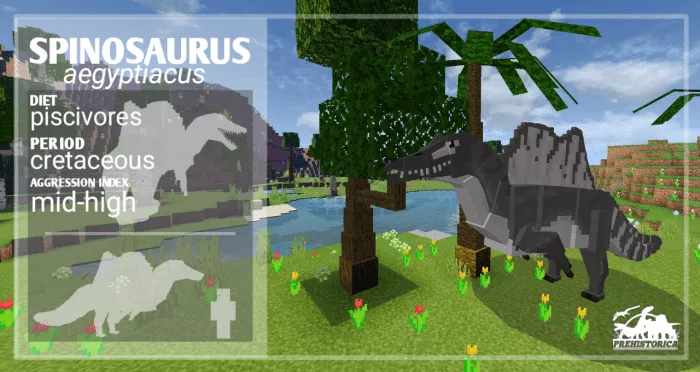 Spinosaurus Aegyptiacus. The spinosaurus is an aquatic predator, easily navigating through water thanks to its fin and tail to hunt for food. Now, not only the land but also the underwater world of Minecraft Bedrock will pose a threat to you.