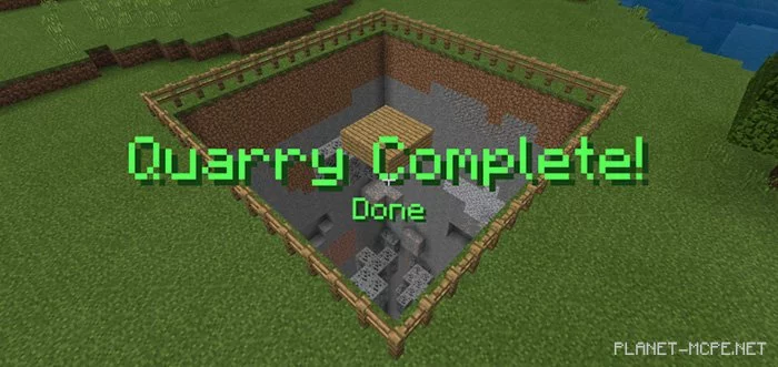 The quarry you create will replace stone, dirt, granite, etc., with air, while leaving all other ores intact. Quarries measure 6 × 6 × 70 blocks! Additionally, a wooden fence will be constructed, and you will receive scaffolding and an iron pickaxe to move up and down for mining ores in Minecraft. On some older devices, the quarry development may take up to 30 seconds.