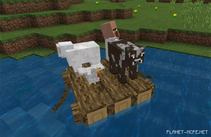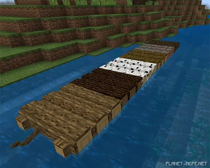 The mod “Raft” transforms boats in Minecraft PE to resemble and function like rafts. The key difference in behavior is that they feature a large imaginary hitbox, allowing you or another Minecraft PE player to stand on it without sitting down. Additionally, these rafts provide more space (4 instead of 2), which is beneficial if you have several friends wanting to share the same raft.