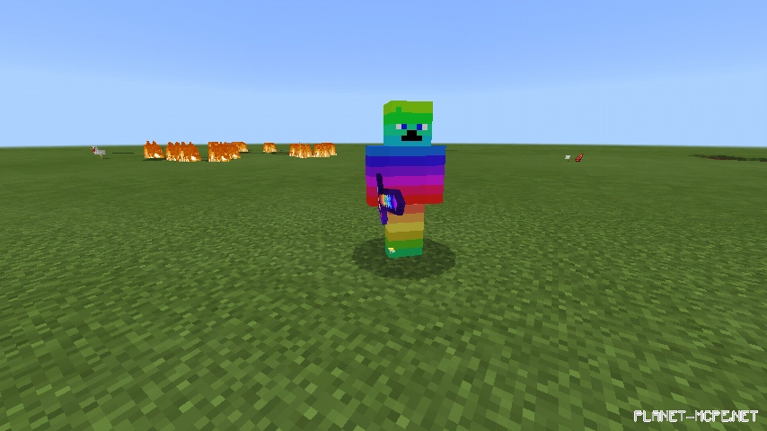 Finally, the vibrant Rainbow Steve has arrived in the world of Minecraft PE. The mod titled Rainbow Steve introduces this legendary character into your MCPE experience. With a health pool of 1000, he can eliminate you if you’re unarmored in survival mode. Additionally, he possesses the ability to teleport and, most notably, can launch fireballs at an incredible speed. Although he wields an enchanted rainbow sword, he won’t use it; instead, it will drop in the MCPE world once you defeat him.