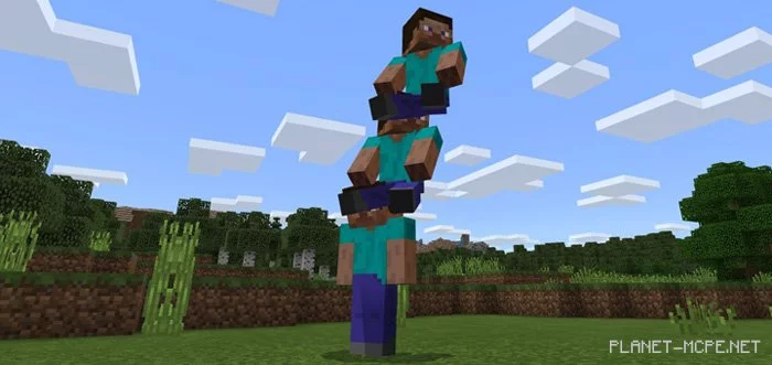 The mod «Ride Players (Mountable Players)» introduces an exciting new feature in Minecraft PE, allowing players to ride on the shoulders of their friends. This can be particularly handy for groups of MCPE players who need to traverse long distances but find themselves too tired to walk the entire way. At such times, you can hop onto your friends’ backs. It also opens up opportunities for some fun acrobatic stunts in Minecraft PE!
