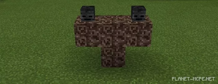 Spawning the robot is identical to the familiar process of summoning the Wither in MCPE. Simply place 3 Wither Skeleton heads on 4 iron blocks, as illustrated in the screenshot below.