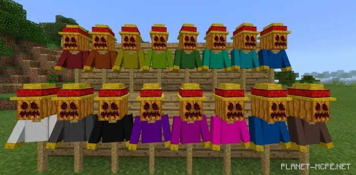 You can deploy scarecrows to deter most monsters in your world, with the exception of witches, villagers, creepers, and phantoms. By default, scarecrows can be found across all biomes in Minecraft Bedrock! There are also 15 different colors available; which one will you choose?