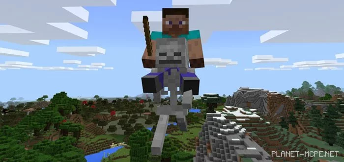 The mod «Skeleton Flying Machine» alters the behavior of skeletons in Minecraft PE, allowing them to be ridden. However, this experience will be quite different from riding a horse. The skeleton flying machine can pass through walls and other obstacles that would typically require destruction in MCPE.