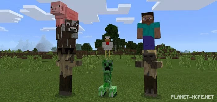 The functionality of this add-on for Minecraft Pocket Edition is straightforward, as you can now place one mob on another (with the exception of zombie pigmen, who cannot be ridden). This means you can stack multiple mobs on top of each other, but don’t expect it to be easy, as they won’t stay still and will run around. Also, remember that players can be placed on any entity in the MCPE world.