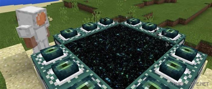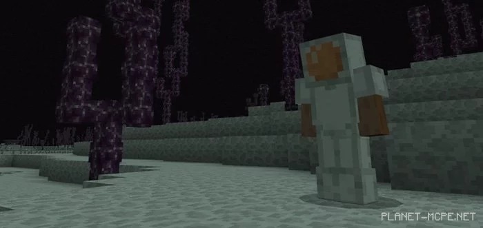 The mod «The Space (Cosmos)» transforms the End dimension into a lunar-themed environment. The Endstone, Endstone Bricks, and End Portal Frames have been slightly redesigned to provide a completely fresh appearance while remaining in the End dimension of Minecraft Pocket Edition. Additionally, gravity is reduced in space, which is why a spacesuit has been introduced.