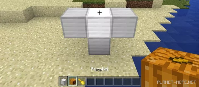First, you need to construct your own bike in the world of Minecraft Pocket Edition. To do this, place 4 iron blocks and put a pumpkin on top, as this vehicle serves as a replacement for the iron golem. Build the structure as shown in the screenshot below, and then place the pumpkin on top.