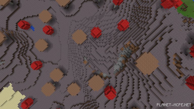 In Minecraft Pocket Edition, mycelium appears as a dirt block covered with gray-purple threads emitting peculiar particles. Naturally, mycelium blocks can be found in Mushroom Island biomes, and while they aren’t particularly good for cultivating most crops—they can’t even be placed in farmland—mushrooms thrive easily throughout this world at any light level!