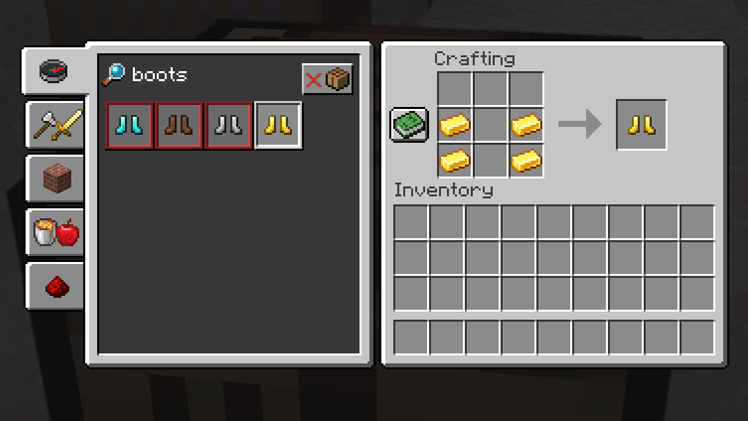 Boots are among the most affordable types of armor, requiring only a minimal amount of materials for crafting: four pieces of leather or four ingots made from any material such as gold, diamond, or iron. To craft them, you need to place the materials in the lower corners of the crafting grid, as illustrated in the image below. If you’d prefer not to use your resources, you can search for boots in chests, buy them from traders, or even catch them while fishing.