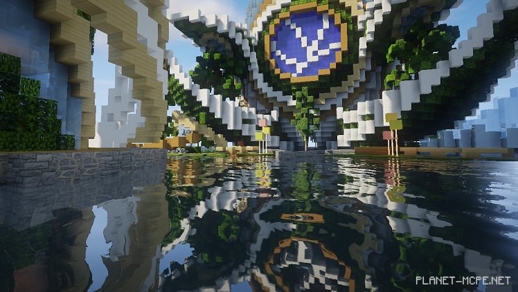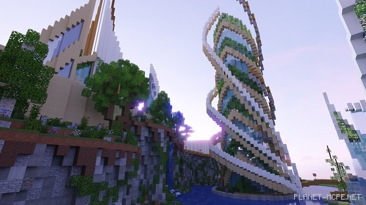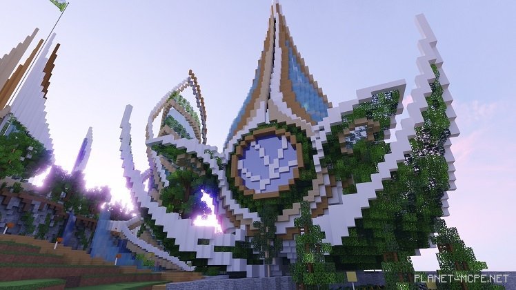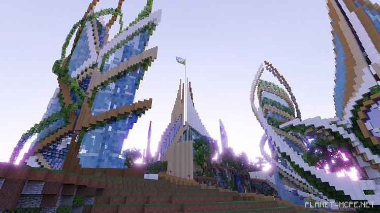 “You can see that these are two completely different structures, both in design and purpose. The Senate was designed in the shape of a droplet, harmonizing beautifully with the rivers and lakes on the map. The lower sections of the Senate feature leaf-like designs, contributing to a unique backdrop and enhancing the theme of sustainability. It appears as if a seed is sprouting directly from the ground. The author believes this combination fits perfectly into the project’s theme for Minecraft PE.