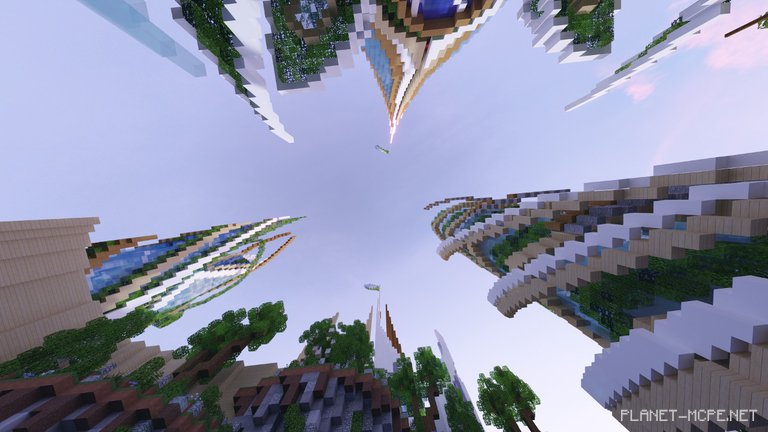 DraGonnet found immense courage in crafting curved lines within Minecraft PE—a game where nothing exists but cubes. However, our artist fully utilized his talent and all available options; no structure in his creation resembles another, and none are square! A crucial aspect is the attention to detail: fluttering flags, coffee cups in homes, bookshelves, and houseplants create a sense of life within the city.