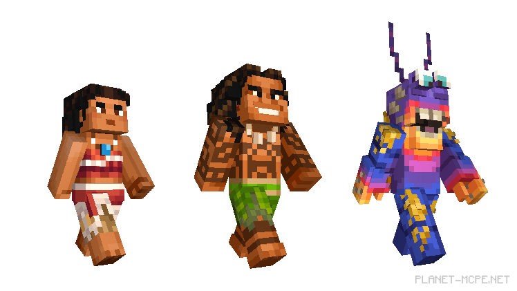 The Moana character pack features a fearless crew of Pacific Islanders, the rocky demigod Maui, giant gold-capturing eels, red coral pirates, watery phenomena, volcanic demons, and other deep-sea dwellers. You can even play as a hilariously foolish chicken in Minecraft PE. Check out the characters included in the pack below or head straight to the Marketplace to grab them faster.